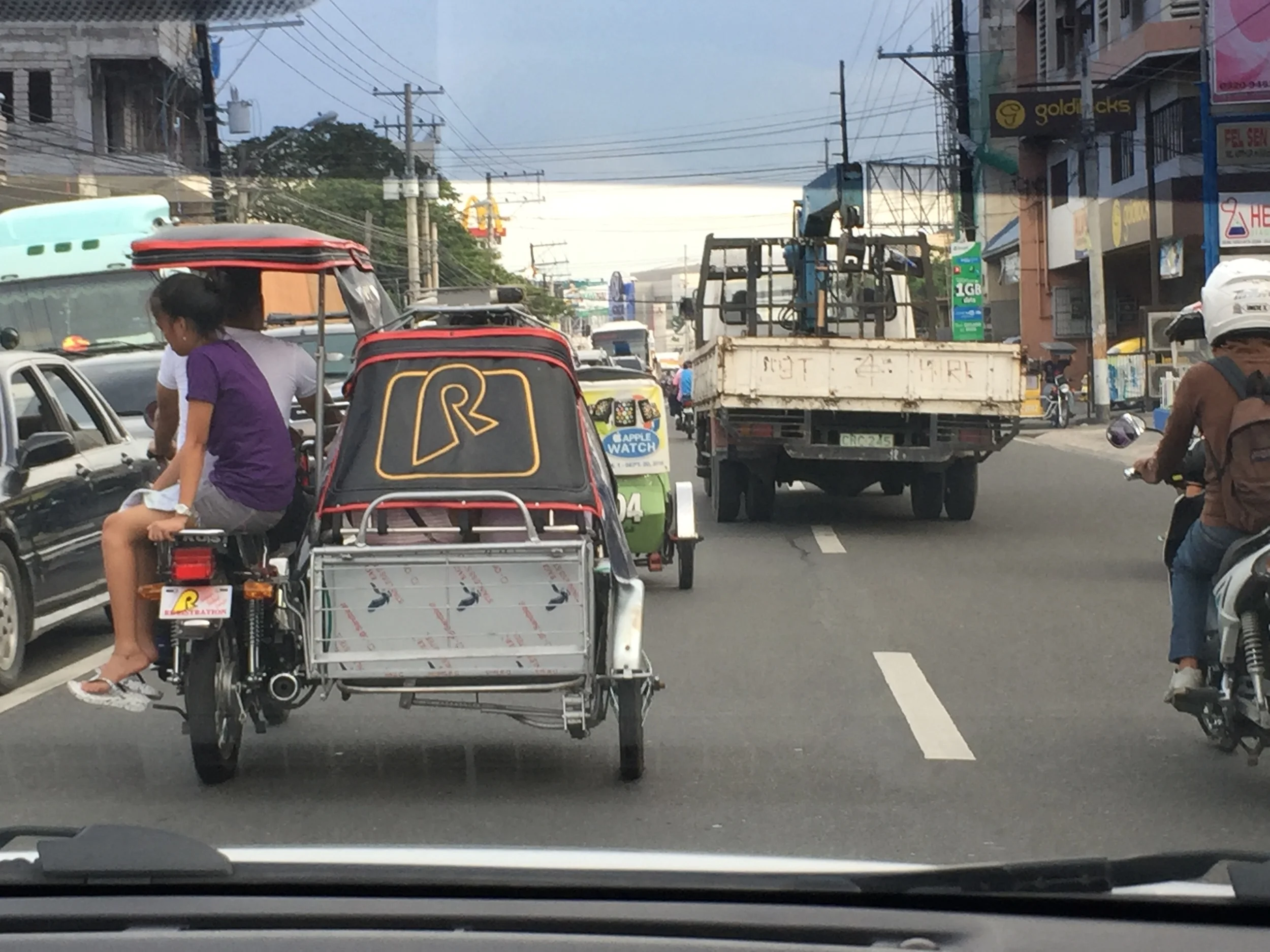 Cabanatuan is the trike capital of the world. Tricycles are usually 100 CC honda motorcycles with a side car bolted on. Most have little cabs for small people to squeeze in. They carry plenty of rope and tie everything on the back rack and top. When the cab runs out of room, one or two riders sit side saddle on the motorcycle and two can stand on the bumpers in back. Top speed is about 30 KPH so if you fell off, it's little more than walking speed. Yes, on rural roads you pass them every chance you get--left or right, whatever works.