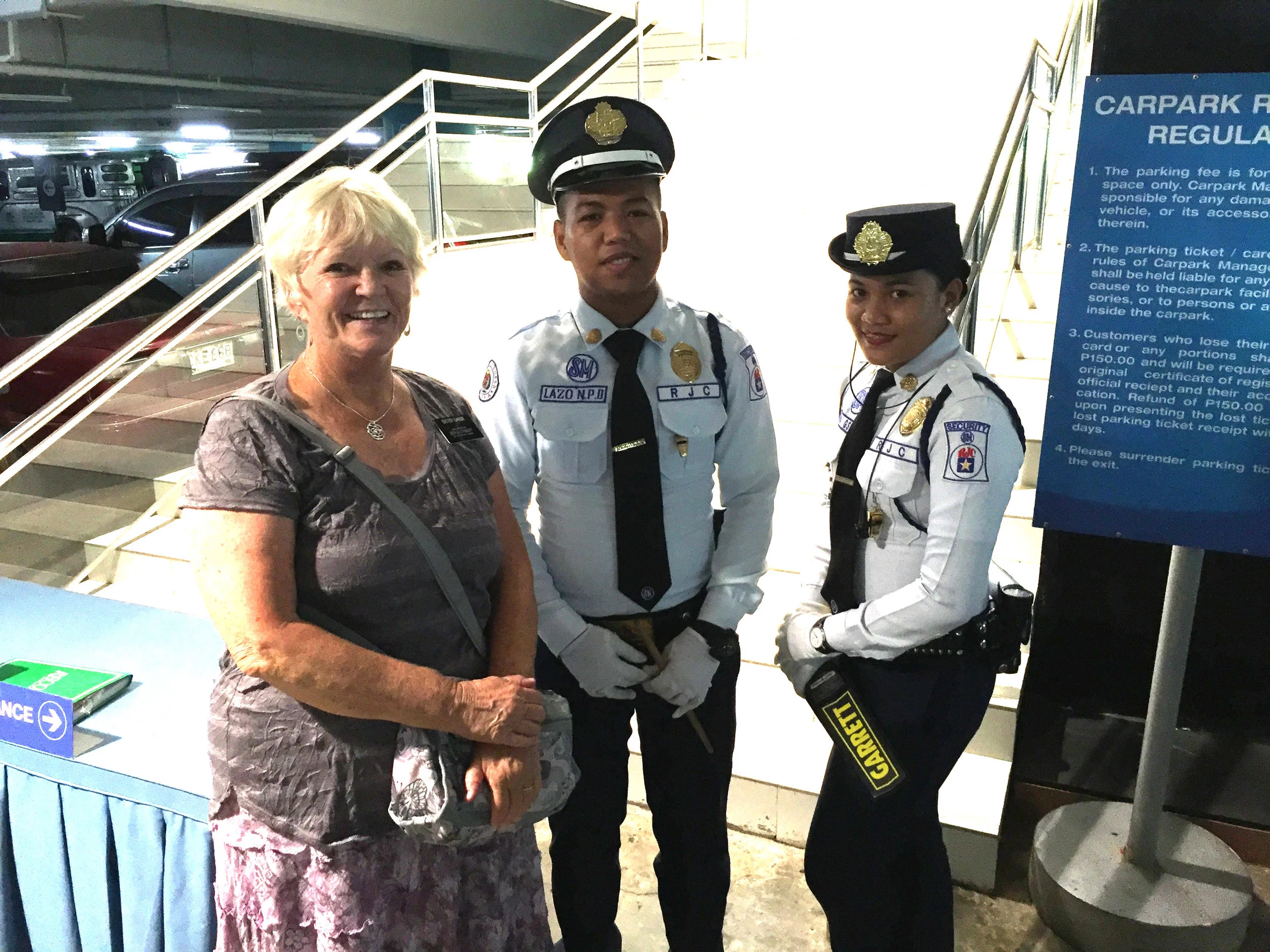 Every store has a security guard or two or three....even seven eleven. They open the doors and are also very polite to we senior missionaries. They all wear the exact same uniform spotlessly clean and pressed. The guards at banks are usually one outside and 2 inside and carry shotguns with no stock. Since this is a cash society, the money trucks look more steel boxes on wheels. Stores have package check and all purses and bags are inspected. Many mall entrances have a separate male and female line with male and female security who check your bags and you for suicide vests. The SM malls parking entrances check under your car with mirrors and inside the trunk. You often pay when you enter to park and have to surrender your ticket when you leave. Once day we lost the ticket and they didn't know what to do. We got out and searched the car for 5 minutes, holding up the traffic until they finally gave up and let us out shaking their heads at the Americans.
